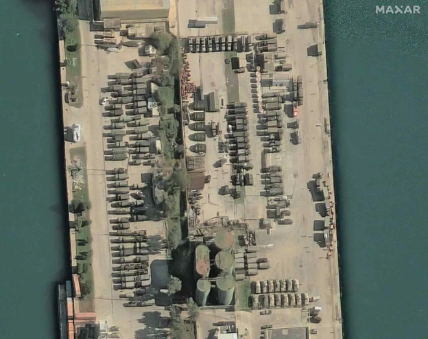 Чекають своєї черги: російська військова техніка та військовослужбовці на причалі в порту Тартус в очікуванні евакуації.