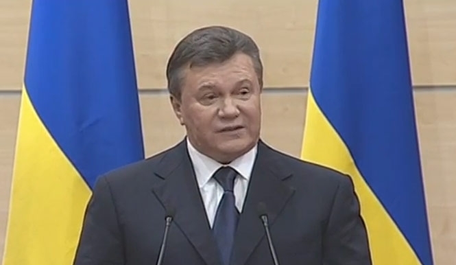 "За ширмою чинного уряду в країні діє банда ультра націоналістів і фашистів. Вони силою захоплюють органи самоуправління, звільняють міліціонерів, міста патрулюють люди в масках. Вони звільняють вищих армійських офіцерів. Вони хочуть поставити армію під прапор Бандери", - заявив Янукович.