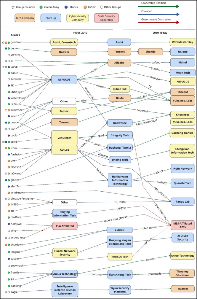 Такі фігури, як Тан Дайлін (wicked rose), Цзен Сяойон (envymask) і Чжоу Шуай (coldface) перейшли з онлайн-форумів до підставних компаній, що здійснюють кібершпигунство для урядових служб безпеки, ставши центральними фігурами у групах APT41, APT17 і APT27. З січня до березня 2025 року не тільки підставні компанії, але й відомі фірми, очолювані членами Red 40, були пов'язані з операціями, що фінансуються державою. Серед них – i-SOON, очолювана Ву Хайбо (shutdown) і Чен Чен (lengmo), та Integrity Tech, очолювана Цай Цзінцзін (cbird).