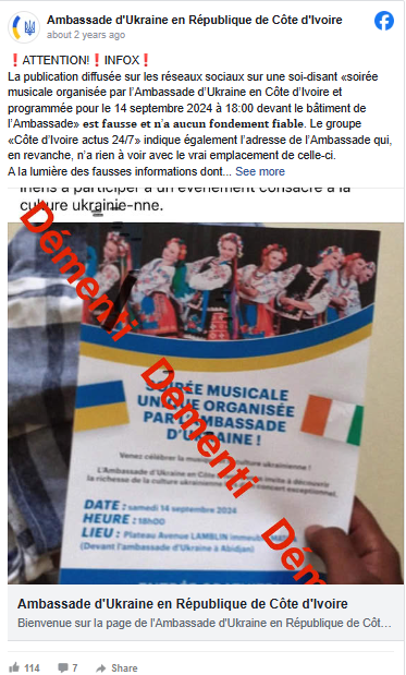 У вересні 2024 року у Facebook і WhatsApp широко поширювалася фотографія фальшивого запрошення на культурний захід, який нібито організувало посольство України в Абіджані. В івуарійських соціальних мережах цей захід подавався як спроба залучити африканських громадян до конфлікту в Європі. Посольство України також офіційно заперечило справжність цього документа.