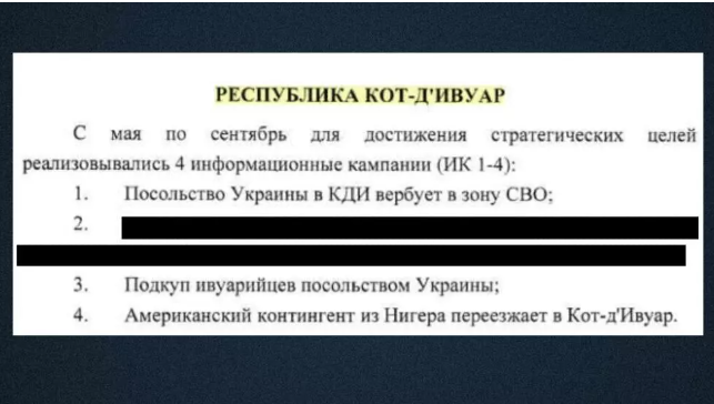 Згідно з цим внутрішнім документом 2024 року, "Компанія" запустила в Кот-д’Івуарі чотири операції впливу або дезінформаційні операції у період із травня по вересень 2024 року.