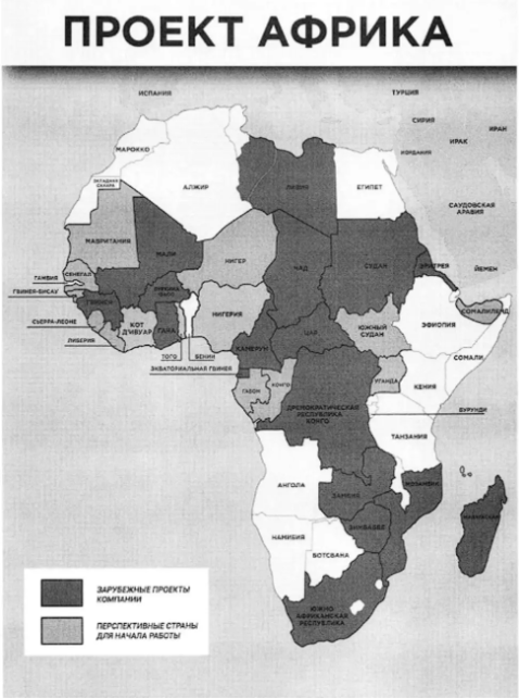 Це мапа 2023 року з документу "Африканський проєкт" "Компанії". Темно-сірим позначено країни, де "Компанія" вже проводить операції впливу. Світло-сірим позначено те, що "Компанія" вважає "перспективними країнами" для запуску операцій.
