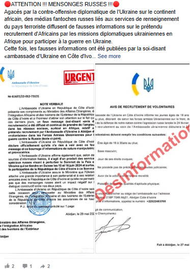 У травні 2024 року в соціальних мережах почала поширюватися фейкова історія про нібито вербування івуарійських солдатів посольством України. У Facebook також активно поширювали зображення фальшивого рекламного оголошення про набір. Посольство України заперечило свою причетність до його створення. Ця кампанія дезінформації продовжилася в липні 2024 року публікацією статті Ghana Web, у якій стверджувалося, що листівки посольства України про набір нібито були помічені на вулицях Абіджана. І в цьому випадку українська дипломатична установа заперечила свою причетність до цих плакатів і додала, що не бачила їх в Абіджані.