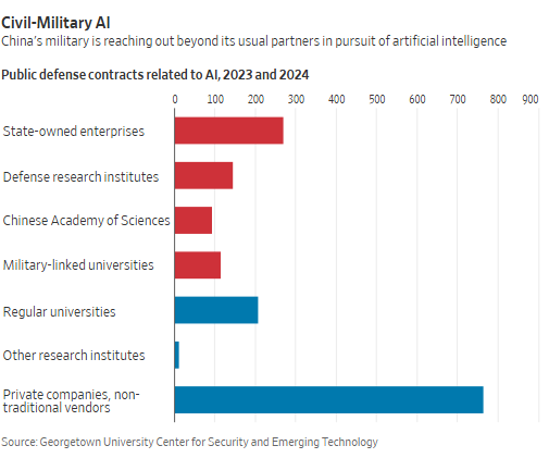 Витягнувши інформацію про підрядників із близько 3 000 оголошень про надання контрактів, пов'язаних із ШІ, опублікованих НВАК у 2023 і 2024 роках, CSET ідентифікував понад 300 компаній, які виграли кілька тендерів. Приватні компанії, цивільні університети та інші структури, які зазвичай не вважаються частиною оборонної індустрії Китаю, становили понад 85% серед тих, хто перемагав кілька разів, і отримали більшість контрактів. Переважна більшість із них не підпадає під санкції США.