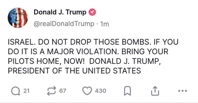 Згідно з красномовним і вишуканим наказом шановного президента Сполучених Штатів (а доданий нижче скріншот є справжнім, це не жарт і не мем), Ізраїль припинив атакувати Іран.