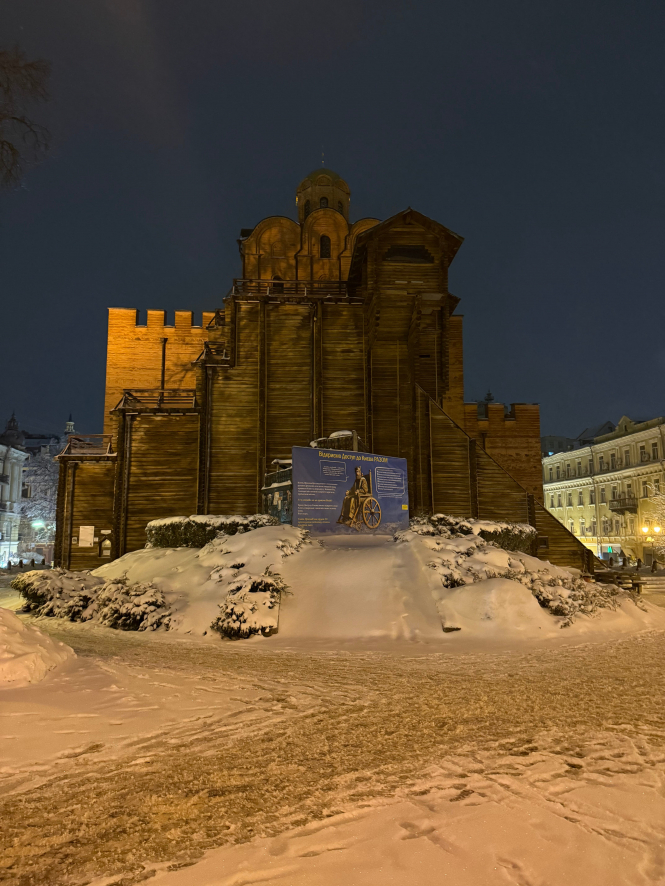 Друга тема моєї поїздки – те, що українці навчилися жити з такими нестатками, які змусили б більшість американців і європейців панікувати і, можливо, зламатися. Останні кілька днів були дуже холодними: мінус 15 градусів за Цельсієм. На фотографії вище зображено Золоті Ворота (звісно, відновлені) у центрі Києва позаминулої ночі. Це може дати вам уявлення про те, як це було. До речі, ось величний Софійський собор у Києві, припорошений снігом.