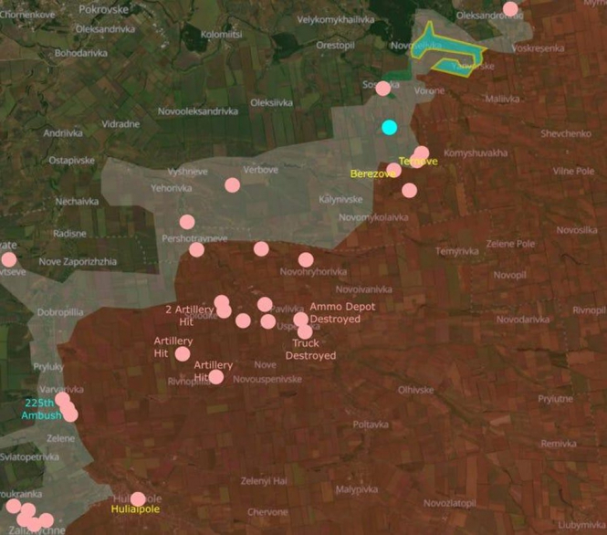 Гуляйполе. Штурмовий полк "Код 9.2" знищив зенітний комплекс "Бук". Зверніть увагу: залежно від версії "Бук" має дальність ураження 45-70 км і часто розгортається за 100 км від лінії фронту.225-й штурмовий полк влаштовує засідку на двох росіян. Уражено російський склад боєприпасів. Уражено російську артилерію та інші цілі.