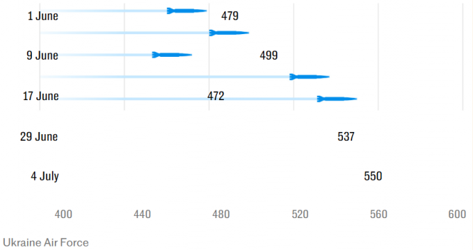 Увечері з 14 на 15 червня ВПС України повідомили, що росія запустила 183 "Шахеди" і макети. Через дві ночі вони запустили 440. Потім, з 22 на 23 червня, ще 352. В ніч з 25 на 26 червня росіяни запустили лише 41, але наступного вечора так званий "ударний пакет" знову збільшився до 363.