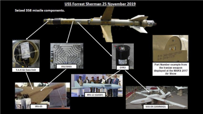 Однак версія ІСНО полягає в тому, що вони застосували зброю, яка, принаймні теоретично, має бути добре відома США. Адже ще в грудні 2019 року екіпаж есмінця ВМС США USS Forrest Sherman (DDG-98) перехопив і захопив партію іранської зброї, що прямувала хуситам у Ємен, і серед іншого захопив кілька зразків саме цієї зброї.