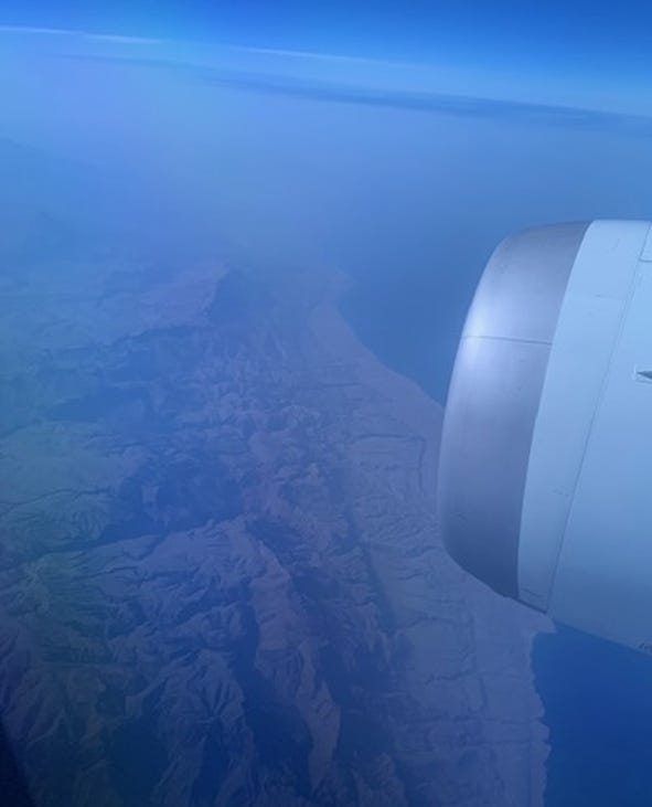 Поклавши руку на серце, це набагато далі на південь, ніж я коли-небудь очікував. Але, зважаючи на те, що КВІР до цього часу заявляв про три атаки на цей авіаносець, а якщо подивитися на місцевий рельєф, пояснення цьому знайти легко. Американці "ховають" свій дорогоцінний бойовий корабель за горами вздовж узбережжя Оману. Випадково два дні тому я сфотографував одну з них – саме тоді, коли Boeing 787 Air India, яким я повертався додому, пролітав значно ближче до Ірану: