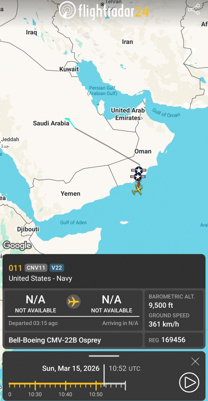 Збройні сили США й далі демонструють майстерність діяти саме так, як не слід. Наприклад, екіпаж цього CMV-22 надто довго залишав увімкненим транспондер, тим самим розкривши місцезнаходження авіаносця USS Abraham Lincoln (CVN-72), до якого він приписаний: