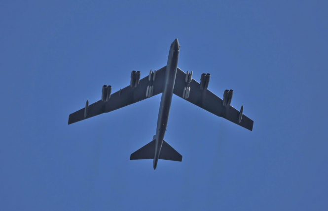 Бомбардувальник B-52 ВПС США, знятий незабаром після зльоту, з 10 ракетами AGM-158 JASSM на підкрильних підвісках.
