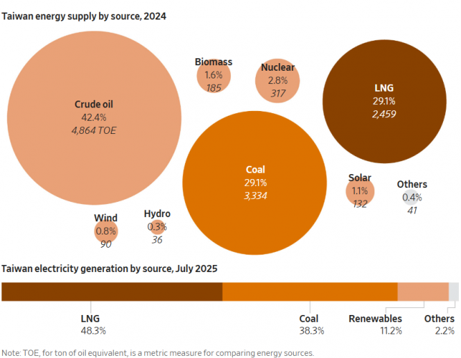 Сонячна й вітрова енергетика поки що не наближають острів до енергонезалежності, зауважує WSJ. "Ми прагнемо максимально розвивати відновлювану енергетику, адже це краще для безпеки Тайваню, – заявив Ву Чі-вей, заступник генерального директора Адміністрації з енергетики Тайваню. – З огляду на нашу залежність від імпорту, це не те, що можна змінити за одну ніч". За його словами, Тайвань прагне до 2050 року довести частку генерації з відновлюваних джерел до 70% з поточного рівня менш ніж 12%.