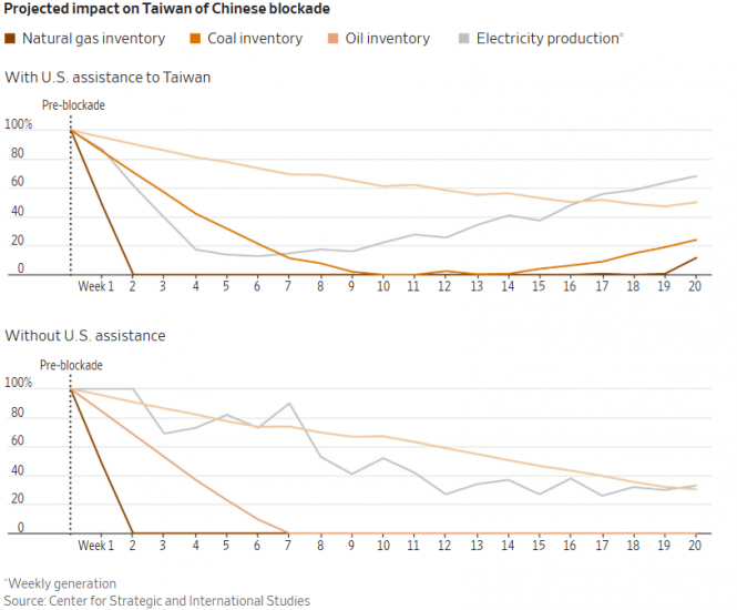 Хоча Тайвань певний час міг би чинити опір китайській блокаді й тимчасово підтримувати виробництво електроенергії, для відновлення електропостачання на довший період острову знадобилося б втручання США, згідно з результатами серії військових ігор, проведених вашингтонським Центром стратегічних і міжнародних досліджень (CSIS).
