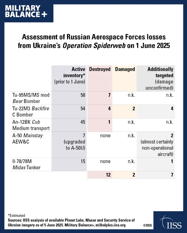 За останні сім днів українці здійснили низку добре продуманих стратегічних атак, покликаних вразити російські військові об'єкти та послабити здатність росії вести війну. Найвідоміша з них – дуже успішна операція "Павутина", в ході якої було знищено велику кількість дорогих, у деяких випадках незамінних, російських літаків за допомогою дронів, які разом коштували кілька сотень тисяч доларів. За останні декілька днів з'явилися досить переконливі докази того, що українці були максимально точними у своїх початкових оцінках російських втрат. Міжнародний інститут стратегічних досліджень склав звіт щодо підтверджених російських втрат (12 літаків) і тих, які можуть бути підтверджені лише як пошкоджені/уражені.