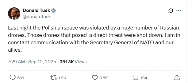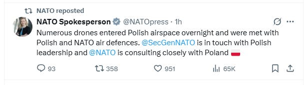 НАТО ж, продовжуючи свою поведінку останніх 3,5 років, намагається вдавати, ніби це не було нападом, і відмовляється так її кваліфікувати. Речник НАТО у своїй першій реакції був дуже слабким, заявивши, що російські дрони "увійшли" у повітряний простір Польщі – ніби вони завітали з якимось візитом.