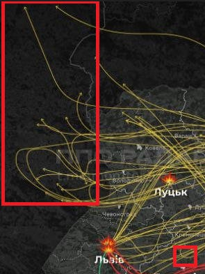 Ще одна ознака провалу країн НАТО полягає в тому, що Альянс навіть не здатний називати речі своїми іменами. Це була однозначно російська атака. Звідки ми це знаємо? Ну, всі безпілотники полетіли до Польщі, жоден не порушив повітряного простору союзників росії – Словаччини та Угорщини (які теж межують з Україною). Ось збільшений червоний прямокутник із мапи вище – бачите, як всі російські дрони прямують на північ/північний захід? Тобто в Польщу.