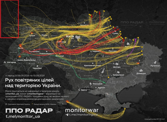 Передусім російська атака була, у порівнянні з тим, що Україна переживає щоночі, дитячою грою. Якщо подивитися на мапу ударів по Україні минулої ночі, то в лівому верхньому кутку видно зовсім невелику кількість російських засобів, які дісталися Польщі. Я обвів їх червоним прямокутником.