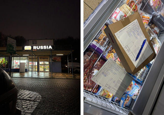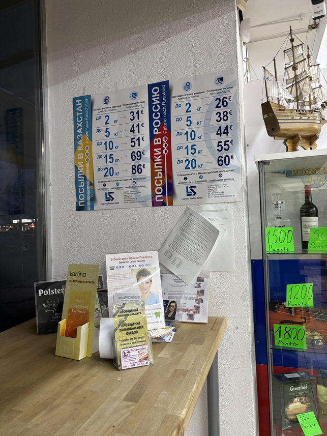 Серед полиць із цукерками та морозильних вітрин у російських супермаркетах по всій Німеччині розміщені оголошення, що рекламують послугу, яку влада намагається заборонити: логістичну компанію, яка спеціалізується на доставці посилок із самого серця Німеччини до росії, попри санкції Європейського Союзу.