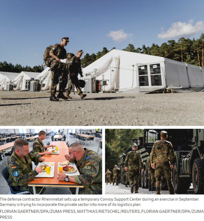 Масштаб необхідних зараз змін продемонстрували цієї осені десь у сільській місцевості на сході Німеччини. Там оборонний підрядник Rheinmetall розбив польовий табір для 500 солдатів із гуртожитками, 48 душовими кабінами, п'ятьма заправними станціями, польовою кухнею, системою спостереження за допомогою дронів та озброєною охороною, яку перевірили на російський і китайський вплив. Він був побудований за 14 днів і демонтований за сім.