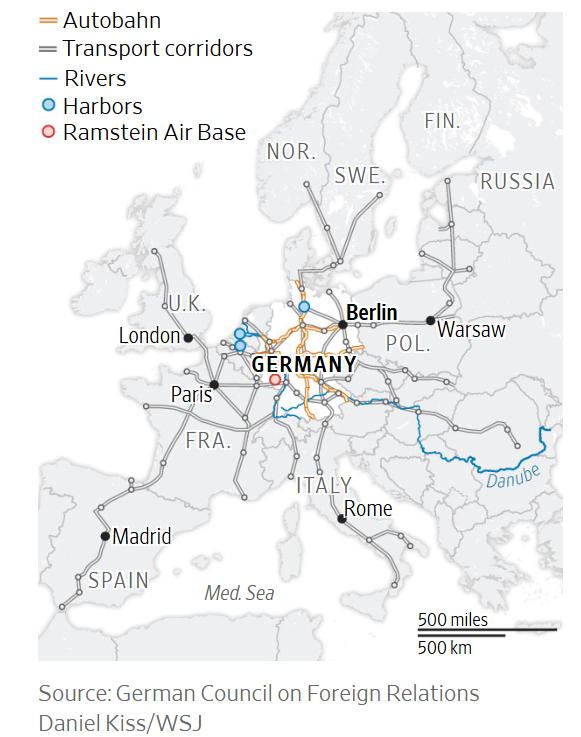 Географічне положення Європи означає, що в разі конфлікту з росією НАТО здебільшого покладатиметься на німецькі порти, залізниці та автомагістралі.