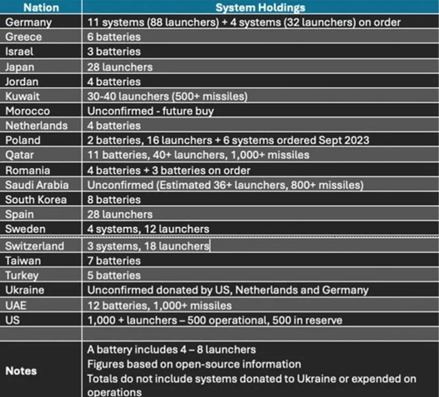 Компанія Raytheon заявляє, що загалом поставила понад 240 зенітно-ракетних комплексів Patriot до 19 країн, а Lockheed Martin – що виготовила понад 10 000 ракет.