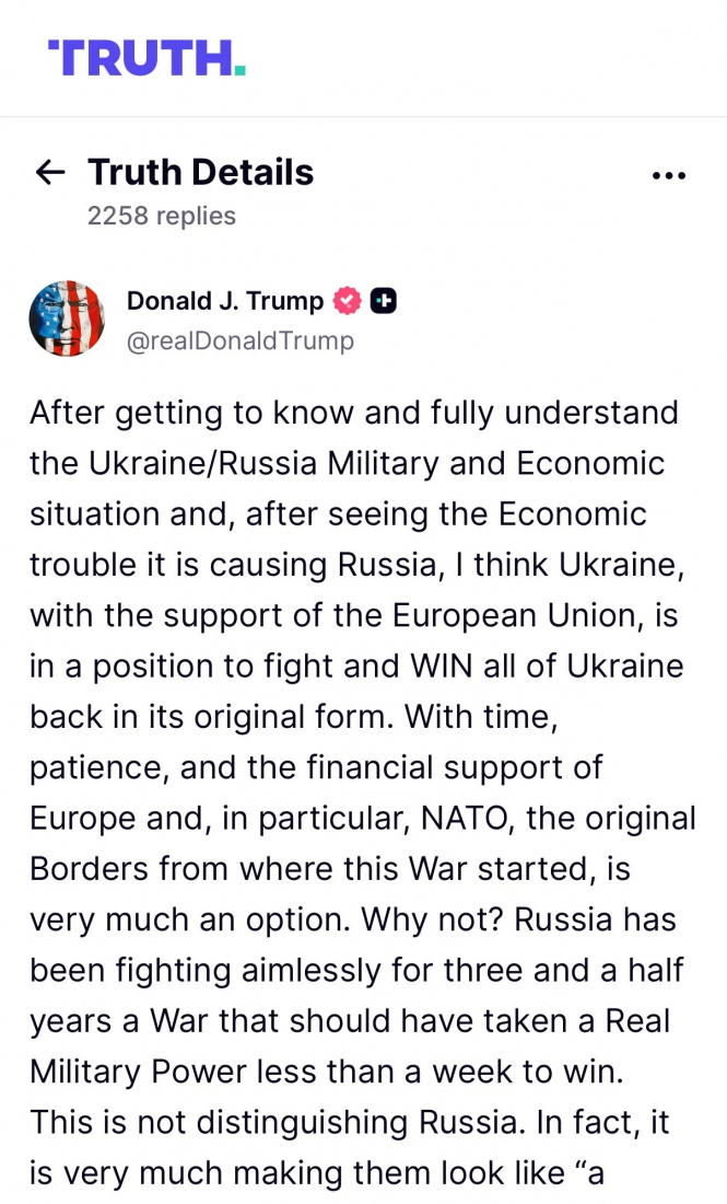 І в середині січня 2025 року (саме в Давосі), і наприкінці вересня, коли Трамп публічно почав заявляти, що росія перебуває у слабкому становищі, я припустив, що його розуміння стану війни можливо змінюється. Трамп справді докладав зусиль, щоб поширити цю версію в ті моменти.