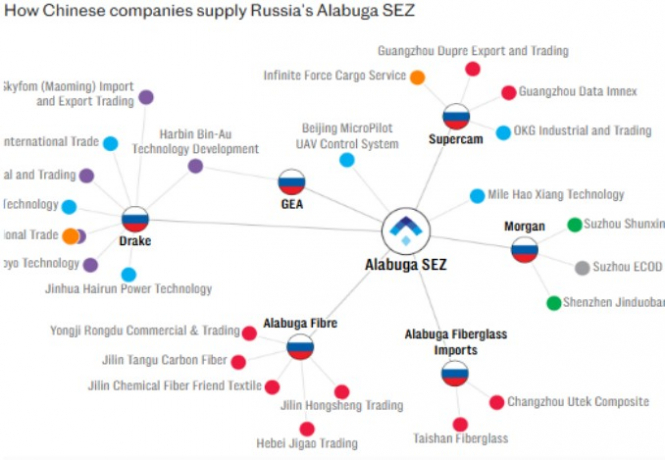 Китайські компанії, серед яких Changzhou Utek Composite, Taishan Fiberglass, Jilin Hongsheng Trading, Yongji Rongdu Commercial and Trading і Hebei Jigao, поставили низку виробів зі скловолокна і вуглецевого волокна, таких як нитки, зв'язувальні агенти, комплектувальні для обробки і порошок скловолокна – все це відправлялося безпосередньо російським фірмам, що працюють в Алабузі й залучені до виробництва дронів "Герань"/"Шахед".