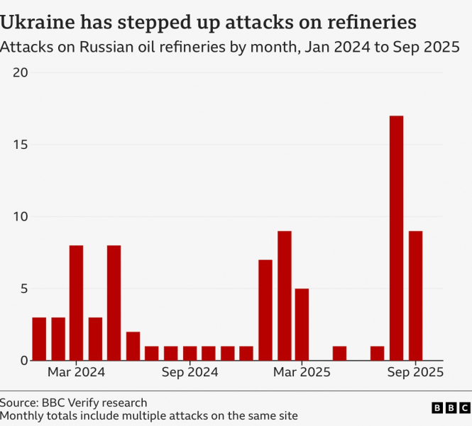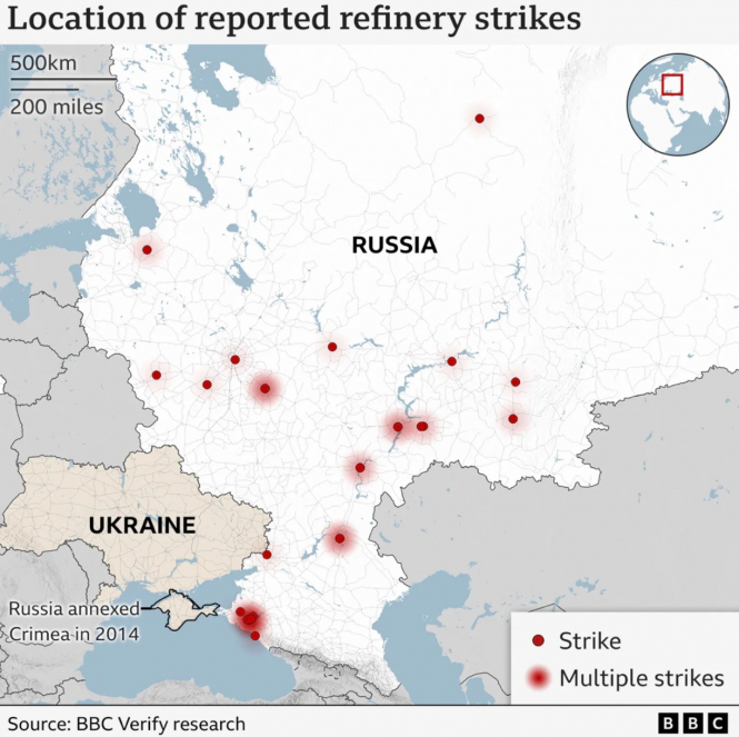 Економічна війна України завдає шкоди росії. Цього тижня з'явилося більше даних та аналізів щодо ефективності кампанії України з нанесення ударів на великі відстані, яка зосереджена на знищенні російської нафтової інфраструктури. Хоча ця кампанія триває принаймні з 2024 року, цьогоріч ефективність окремих ударів (які на довше виводять з ладу російські об'єкти) та кількість уражених цілей значно зросли. Ця комбінація значно посилює тиск на постачання палива в росії.