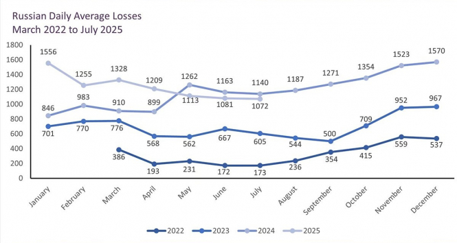 Ця частина року, з жовтня до грудня, історично була періодом з найбільшою кількістю жертв із 2022-го. Як показують останні дані британської розвідки (серпень 2025 року), жовтень, листопад і грудень є піковими періодами бойових дій і жертв (принаймні для росіян).