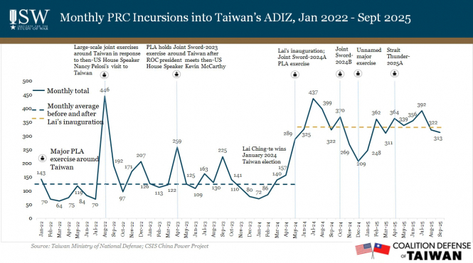 У Тихоокеанському регіоні Китай продовжив операції довкола Тайваню, включаючи щоденні вторгнення у повітряний простір Тайваню, а темп військових навчань союзників залишався високим.