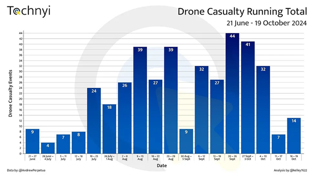 З 21 червня до 19 жовтня 408 цивільних осіб, поліцейських, медиків і волонтерів були поранені або загинули в результаті атак безпілотників. Зменшення кількості жертв з 11 до 19 жовтня співпадає з періодом сильних дощів. Ця доповідь свідчить про те, що цивільні особи використовуються як тренувальні мішені. Приблизно 18% жертв у віці 21-40 років, 41% – 41-60 років, 33% – 61-80 років.