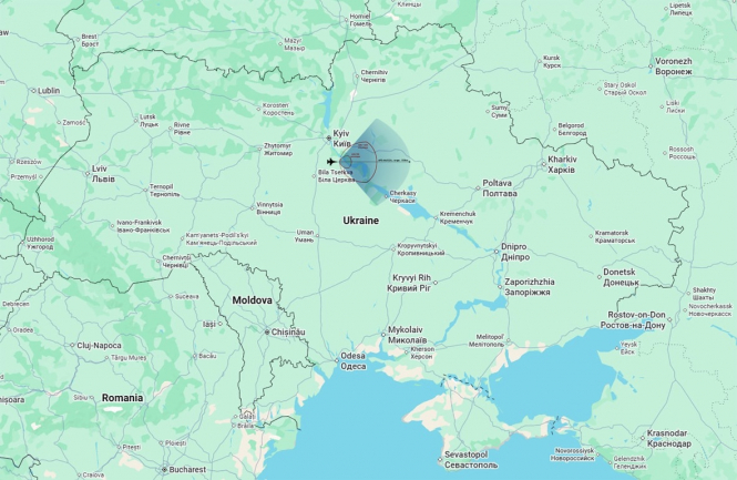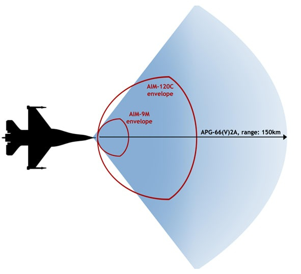 Причина, з якої пілотів і наземних диспетчерів під час навчання буквально привчають мислити саме так, полягає в зонах ураження бортового радара/системи керування вогнем і озброєння літака. Теоретично зона ураження радара APG-66(V)2A в окремих режимах роботи є "гігантською": вона сягає приблизно 150×150 км (я свідомо спрощую, не заходячи в деталі про режими роботи радара тощо). Теоретично, якщо накласти це на карту України, вийде приблизно таке: