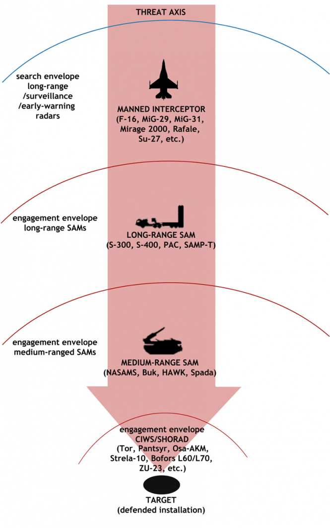 Справа в тому, що так чи інакше – незалежно від країни чи кількості грошей, незалежно від компетентності чи некомпетентності, і незалежно від отриманої стратегії (або її відсутності) – основи тактики ППО, базові принципи, за якими служби організовують і забезпечують роботу ППО, завжди однакові. Тобто саме так, як описано наприкінці частини 2: у формі цибулини. За винятком того, що йдеться про протиракетну оборону від балістичних ракет і спрямованість у бік ворога (тобто "вздовж осей загрози"). Тоді: