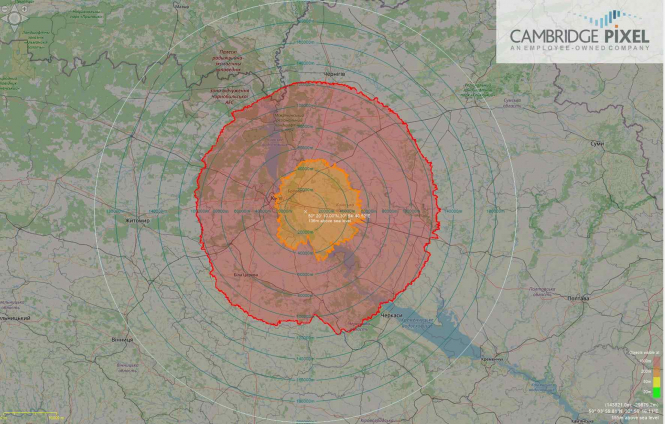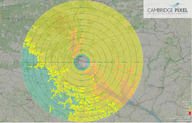 Чудовий приклад місцевості з "надзвичайно низьким радіолокаційним горизонтом": Міжнародний аеропорт "Бориспіль", на південний схід від Києва. Рельєф у цій місцевості настільки низький (як, власне, і більша частина рельєфу північної та північно-східної України), що будь-який радар з дальністю дії (наприклад) 200 км, встановлений на щоглі (або іншому об'єкті) на висоті всього 10 м над землею, не має радіолокаційного горизонту для цілей, що летять на висоті нижче 200 м. Діапазон покриття для об'єктів, що рухаються на висоті від 200 до 1000 м (зона, позначена помаранчевим кольором), обмежений дальністю близько 40 км, а для об'єктів, що летять на висотах біля 1000 м (зона, позначена червоним кольором) – близько 120 км. Це просто найгірше місце для розміщення радара: якщо вже доводиться ставити його там, то на високому штучному об'єкті.