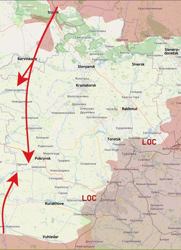 Пояснюю все це тому, що один із перших "хороших прикладів розгортання" ІПСО у цій війні стався приблизно тоді ж: на початку квітня 2022 року, після відмови від "плану А", тобто захоплення або принаймні ізоляції Києва, Пуддінг і його "тупоголові командири" перейшли до "плану Б". Вони перекинули підрозділи, виведені з північної та північно-східної України, в район Куп’янська і розширили те, що спочатку було лише "додатковим планом" (ізолювати Харків, а потім прориватися на Слов’янськ і Полтаву), до головного зусилля: захопити Ізюм, далі Барвінкове, а потім рухатися в напрямку Покровська з метою відрізати підрозділи ЗСУ, які все ще утримували сильно укріплену лінію зіткнення, що лишилася після війни 2014-2015 років. Приблизно за такою схемою: