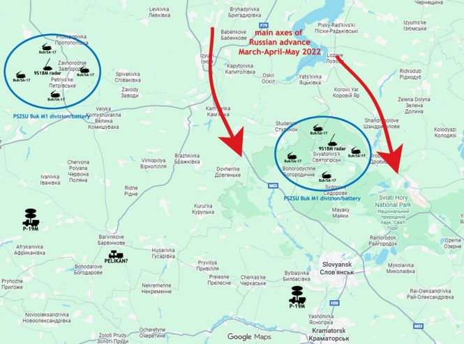 (Приблизна) реконструкція локальної ІСПО, створеної ПС ЗСУ в районі Барвінкового-Слов'янська в квітні-травні 2022 року. Показано лише основні елементи української ППО (тобто всі наземні підрозділи тощо опущені): дві батареї "Бук М1" та допоміжні радіолокаційні станції спостереження. Майже зайве казати, що все працювало в режимі EMCON і вмикалося лише тоді, коли була впевненість, зіткнення з ворожими літаками неминуче. Розвіддані про те, коли саме активуватися, надходили від радарів дальнього радіолокаційного спостереження/раннього попередження та систем радіоелектронної розвідки "Кольчуга".