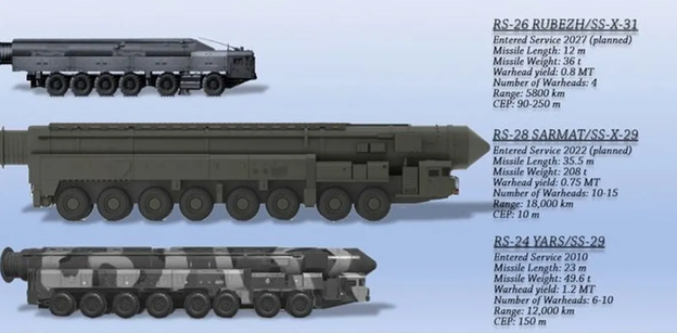 Приблизне порівняння МБР РС-26 з двома "справжніми" МБР, РС-28 "Сармат" і РС-24 "Ярс".