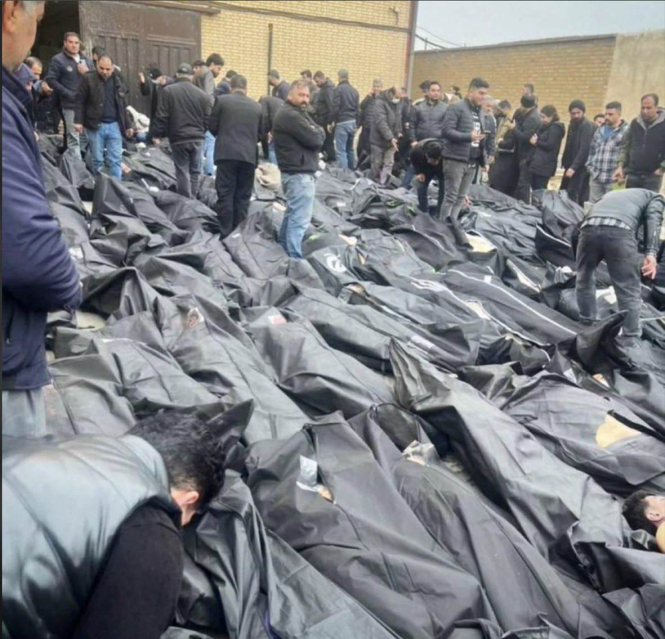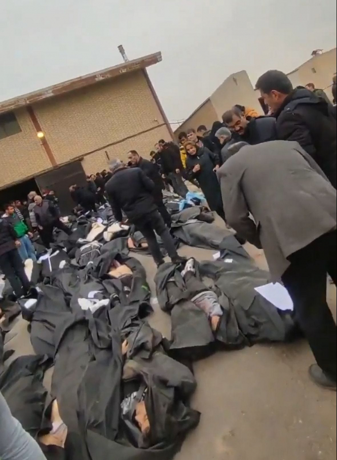 Так, буквально "купи мішків для трупів" перед моргом у Кахрізаку (передмістя Тегерана) 11 січня. Цинічні бандити з КВІР широко вимагали (і досі вимагають) від сімей/родичів/друзів вбитих протестувальників "плату" за видачу їхніх вбитих родичів або знайомих.