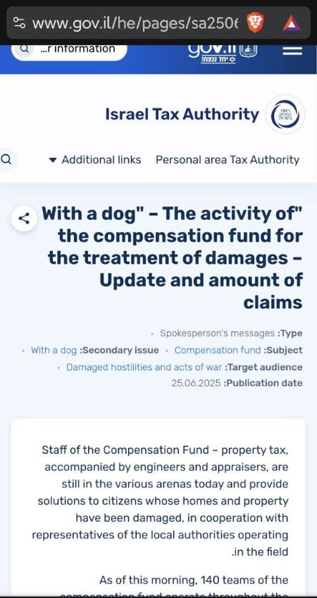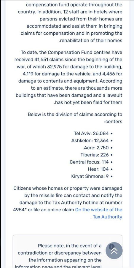 Видалено 26 червня 2025 року: веб-сайт уряду Ізраїлю, на якому (на той час) було задокументовано загалом 41 651 заявку на компенсацію, подану громадянами Ізраїлю за збитки, пов'язані з війною, спричинені ракетними ударами Ірану. Зверніть увагу: це не включало всі бази армії та численні дії вздовж лінії припинення вогню/кордонів Ізраїлю. Загалом, це лише побічно вказувало на фактичну суму збитків, завданих Ізраїлю Іраном за останній рік, включаючи той факт, що Ізраїль просто не міг більше продовжувати фінансувати продовження цієї війни.