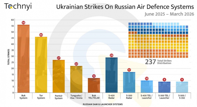 Із червня 2025 року до березня 2026 року Tochnyi задокументував 492 атаки на російські системи ППО і 433 атаки на засоби РЕБ, радари та командні системи, причому кількість ударів по системах ППО стабільно зростає. Можна припустити, що є й додаткові компоненти ППО, знищені без публічних підтверджень або без фіксації на комерційних супутникових знімках.