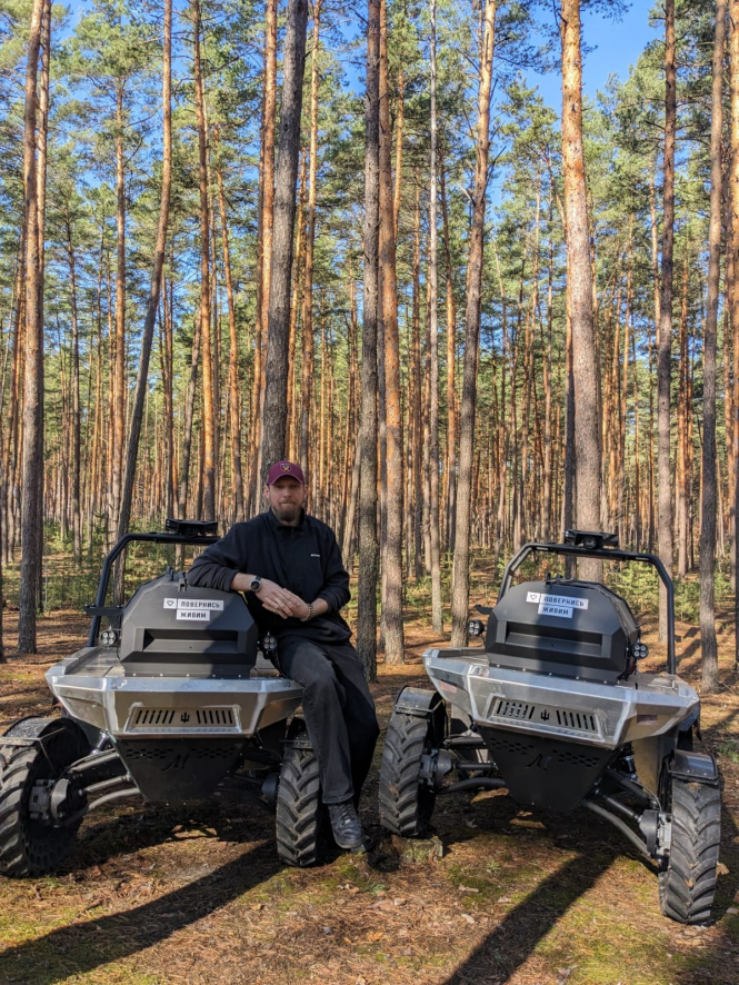 Перш ніж перейти до суті цього тижневого огляду, який зосередиться на тому, що, здається, є ще більш вираженим зрушенням у способах завдання втрат на полі бою, я хотів би подякувати всім читачам, які пожертвували на "Повернись живим" після прямого ефіру на Substack з Богданом Желобчуком. Ці дві речі насправді пов'язані між собою. Богдан розповідав про те, як українці розробляють і використовують наземні роботизовані комплекси (НРК) для виконання значної частини небезпечної і складної роботи на полі бою. Оскільки людей дедалі легше виявити і вбити, для українців вкрай важливо просуватися вперед у цьому напрямку. Такі НРК виконують широкий спектр завдань: від доставки припасів (логістика) до евакуації поранених і навіть безпосереднього бою з противником. На фото – Богдан із двома логістичними транспортними засобами.