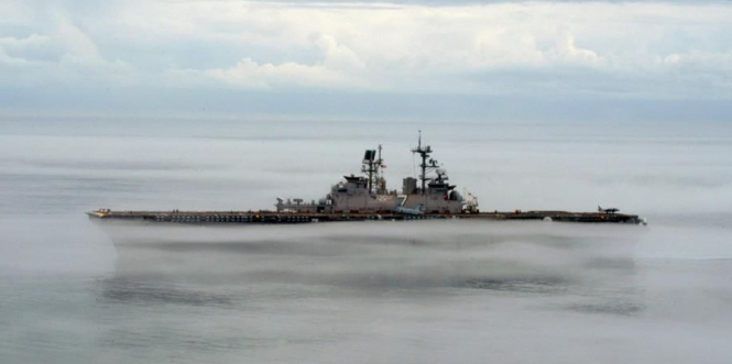 USS Iwo Jima, як його бачили кілька днів тому, коли він йшов крізь туман.