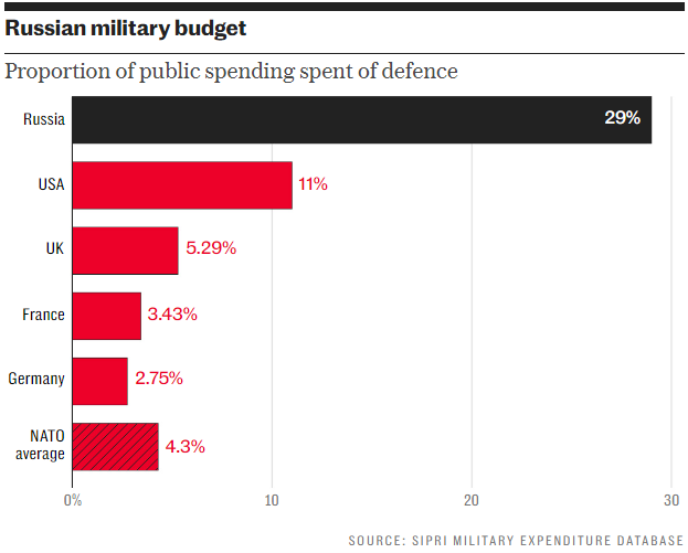 "росія будує "гарячу" економіку війни. Оборонні витрати в усіх формах потроїлися з моменту вторгнення в Україну і наближаються до 8% ВВП, що приблизно відповідає рівню Радянського Союзу", – пише у колонці редактор відділу світової економіки The Telegraph Амброз Еванс-Прічард.
