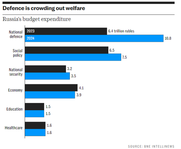 За словами Еванса-Прічарда, показники ВВП росії – це "червона ниточка". Дефіцит робочої сили та обмеження виробничих потужностей призвели до перегріву економіки, підштовхнувши процентні ставки до 16%, тоді як те, що залишилося від економіки споживання, атрофується. З початку війни ліквідні активи Фонду національного добробуту впали з 6,6% до 2,7% ВВП.