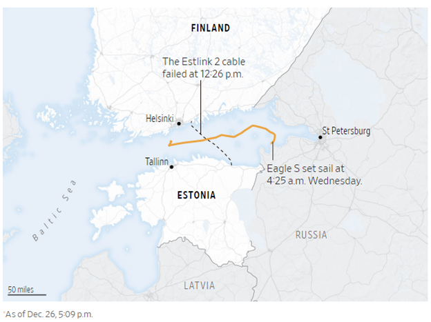 WSJ інформує, що танкер Eagle S перетнув кабелі, що з'єднують Фінляндію та Естонію, приблизно в той час, коли вони перестали функціонувати в середу після 12 години дня. Судно сповільнило хід, коли досягло силового кабелю Estlink 2, а потім затрималося над ним, перш ніж продовжити свій шлях, згідно з даними сайту для відстеження суден Marine Traffic.