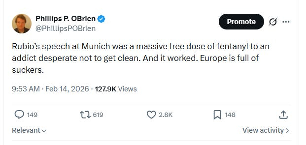 Проста правда полягає в тому, що Рубіо в тексті визнав, що результат війни на даний момент є для США цілком другорядним, і, безумовно, не настільки важливим, щоб про нього згадувати в промові про трансатлантичні відносини. Фактично, лише під час сесії запитань і відповідей після промови Рубіо був змушений дати обережну відповідь на запитання про війну. Після натиску він зайняв виразно нейтральну позицію. США хочуть угоди, з якою росія може бути задоволена або яку вона може "прийняти". Ключовим моментом було явно "закінчити" війну, а не захищати європейську демократію. Ось цитата зі стенограми.