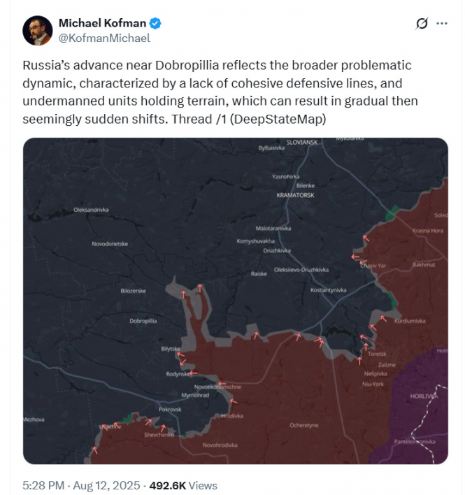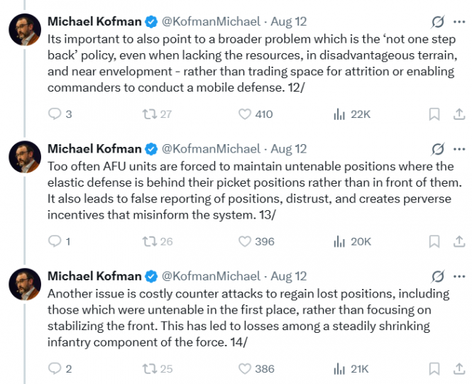 Тепер Майкл Кофман одразу ж кинувся максимально драматизувати ці події й подати їх у найгіршому світлі. Ось уривки з його твітер-треду на цю тему. По-перше, цей наступ нібито демонструє величезні проблеми України.