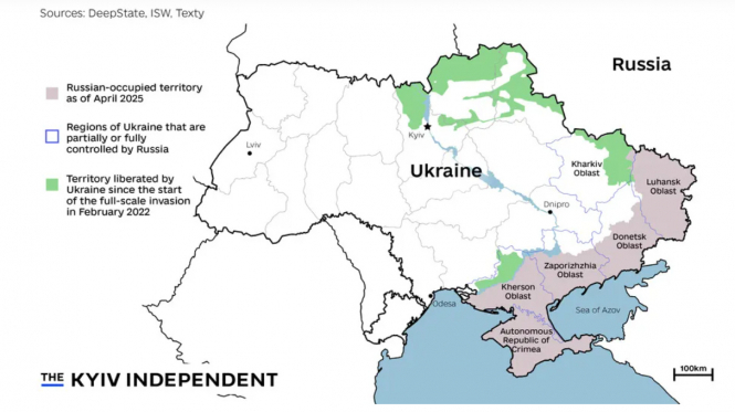 Інакше кажучи, Сполучені Штати не лише легітимізують незаконні російські загарбання, а й наполягають, що ці загарбання слід розширити. Видання The Kyiv Independent підготувало наочну карту (див. нижче). Найважливіше на ній те, що велика незахоплена частина Донецької області (позначена білим) мала б відійти росії за цією "угодою", так само як і невелика частина Луганщини, що залишилася непідконтрольною. До цієї території входять, зокрема, міста Краматорськ і Слов'янськ, оточені потужними оборонними укріпленнями.