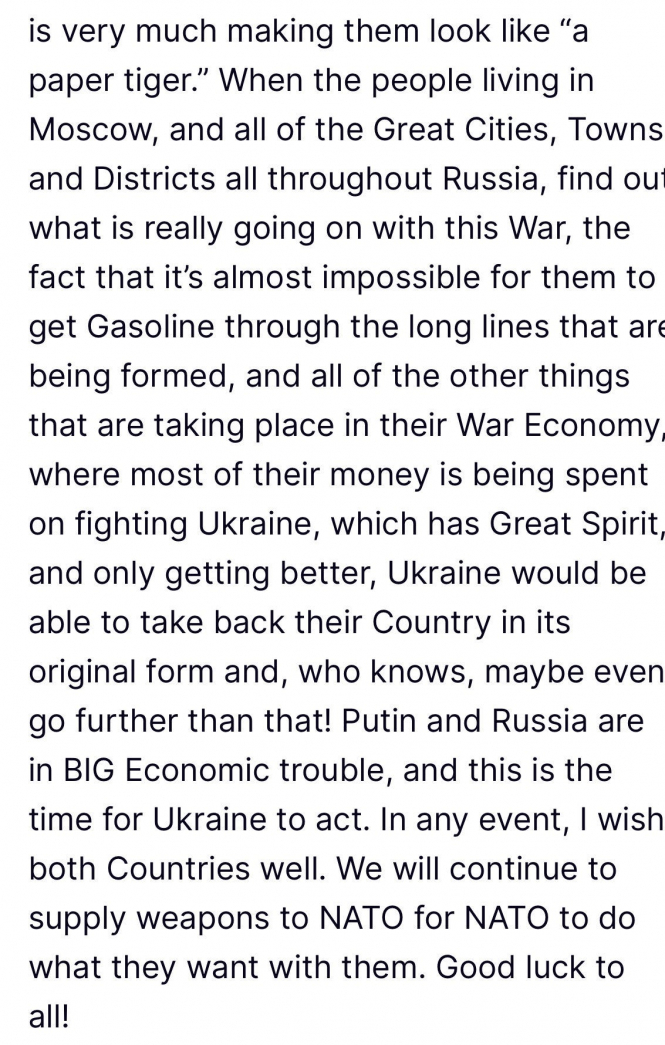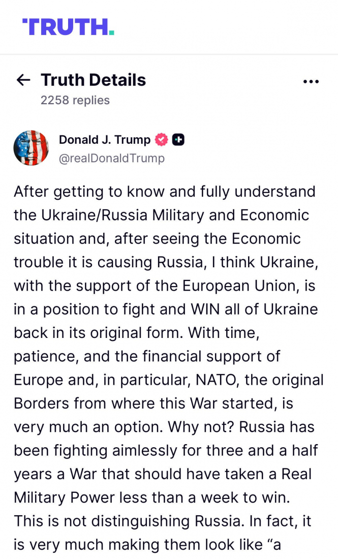 І тепер цей аргумент буде куди важче повторювати, навіть якщо Трамп змінить тон після вчорашнього надзвичайного спалаху емоцій. Вперше він чітко висловив те, що завжди було правдою. Україна може виграти війну, Україна може звільнити свою територію, а росія є значно переоціненою силою, "паперовим тигром" з економікою, що дедалі слабшає через українські атаки на російське нафтовидобування. Ось твіт, у якому він, так би мовити, "викрив себе".